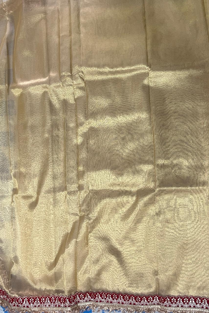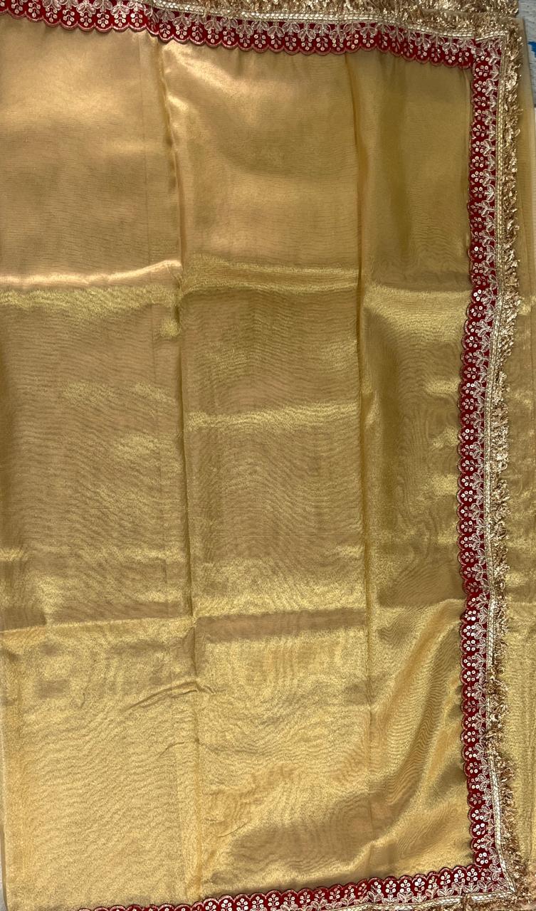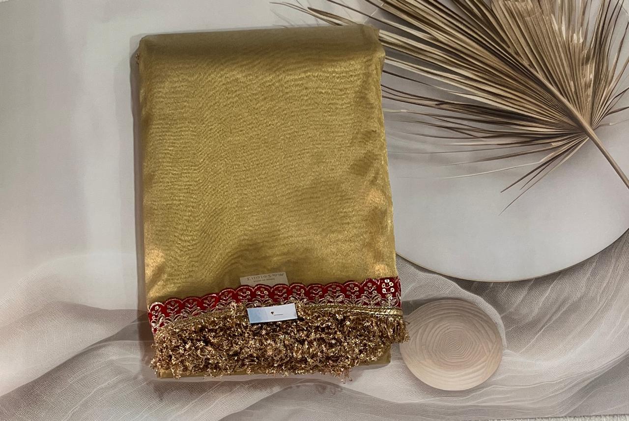 Deepika Padukone inspired Golden tissue Saree with running pallu and red border lace