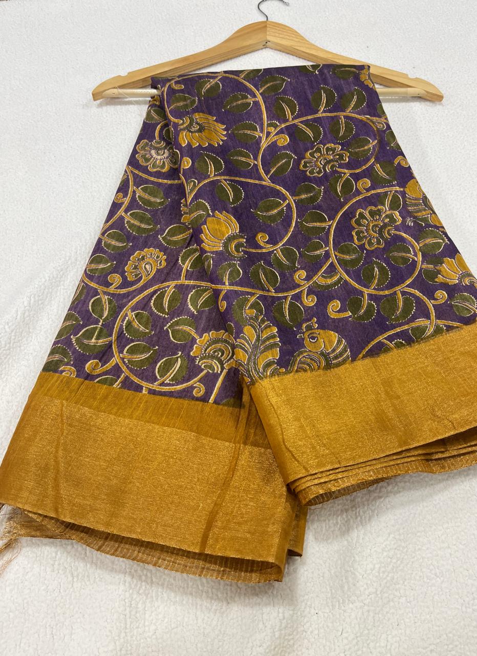 Linen Kalamkari with Tissue blended Silk saree with beautiful print all over the saree with contrast border