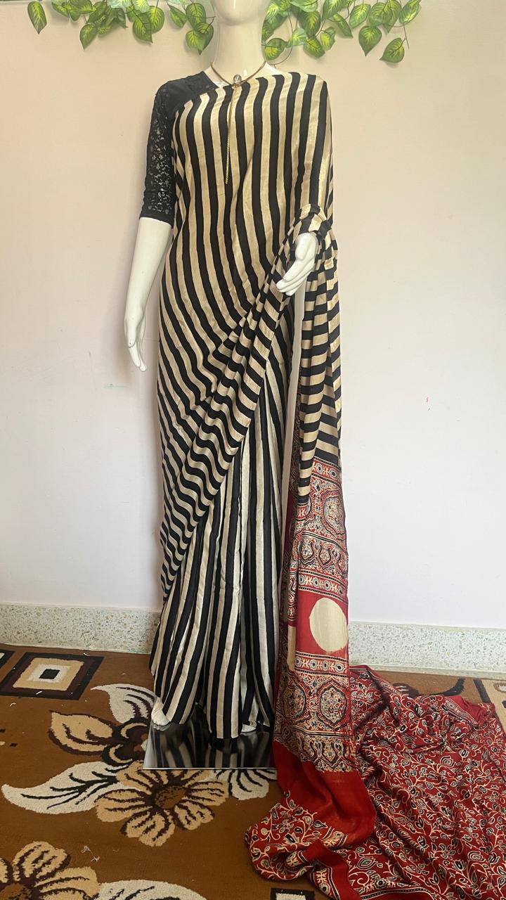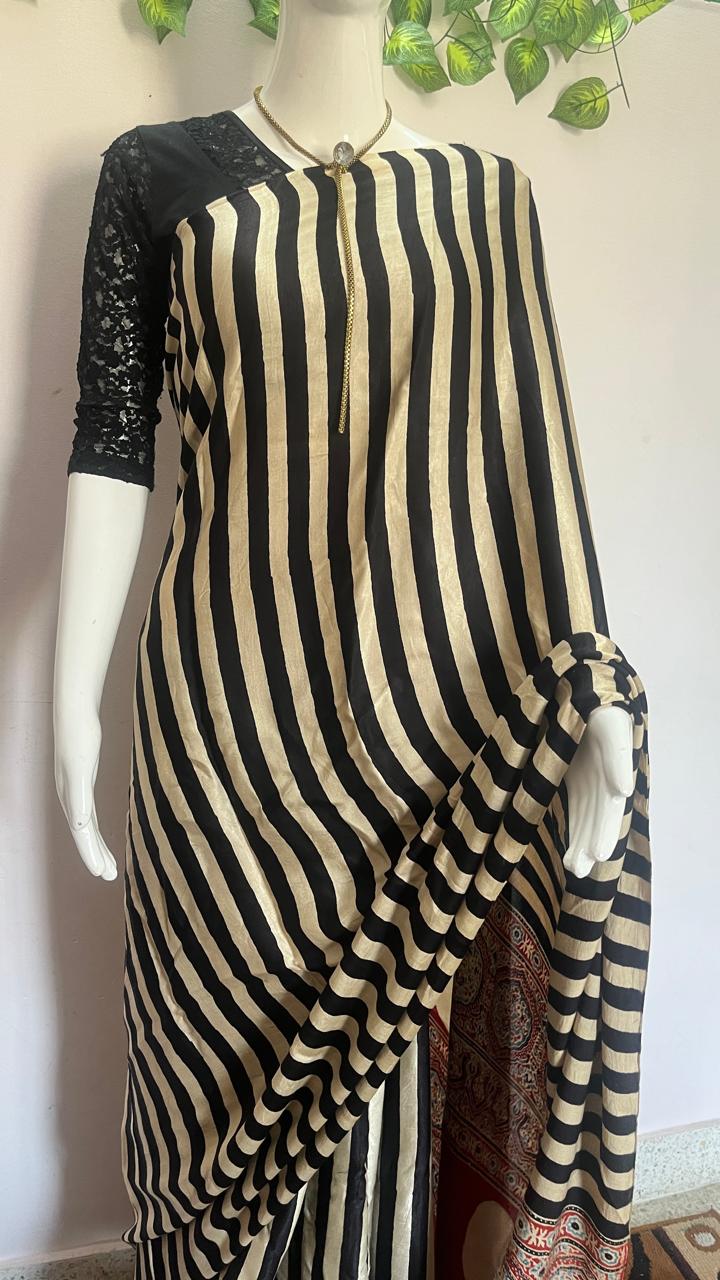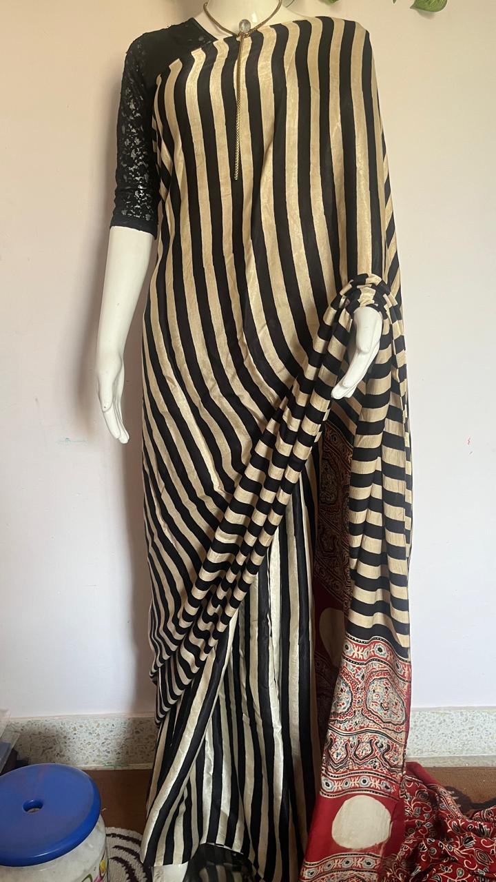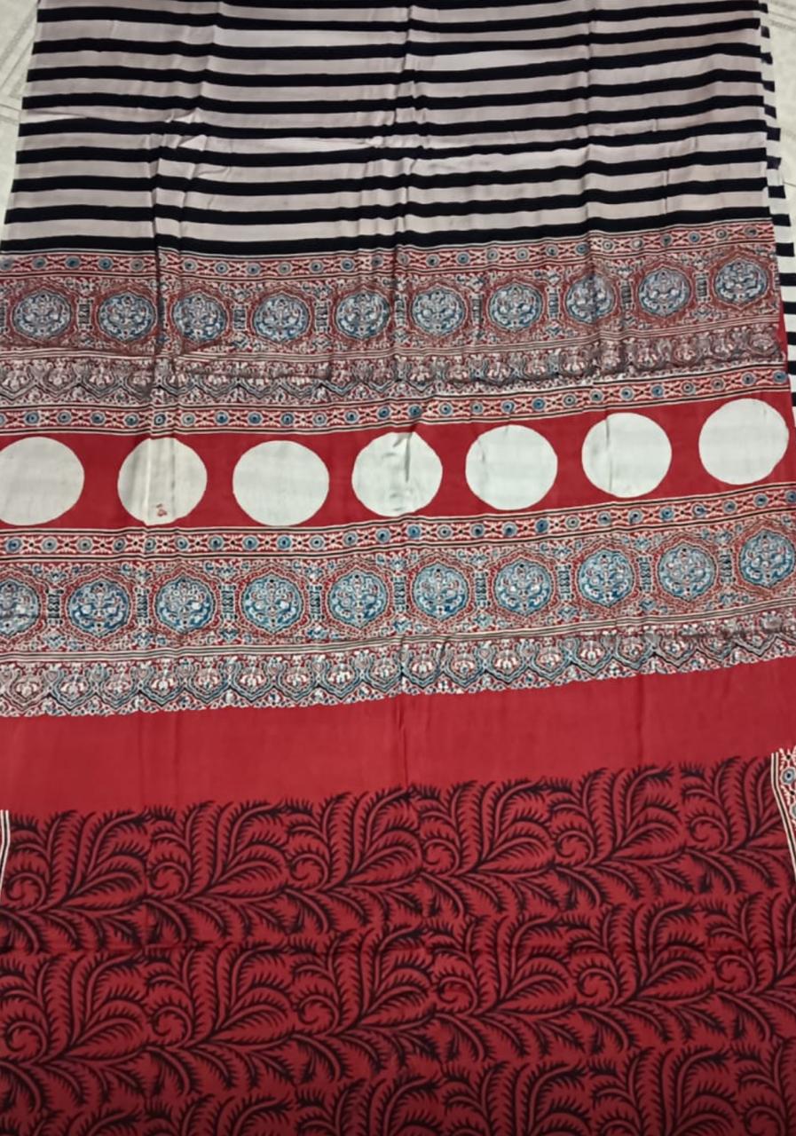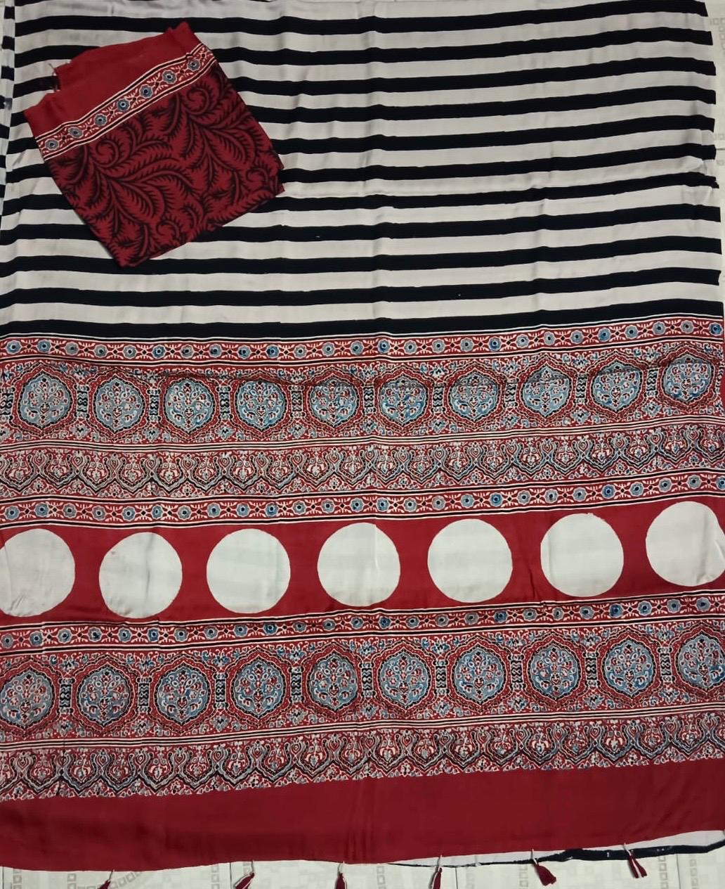 Pure Modal Silk with Ajrak print with Vertical strips all over the saree.