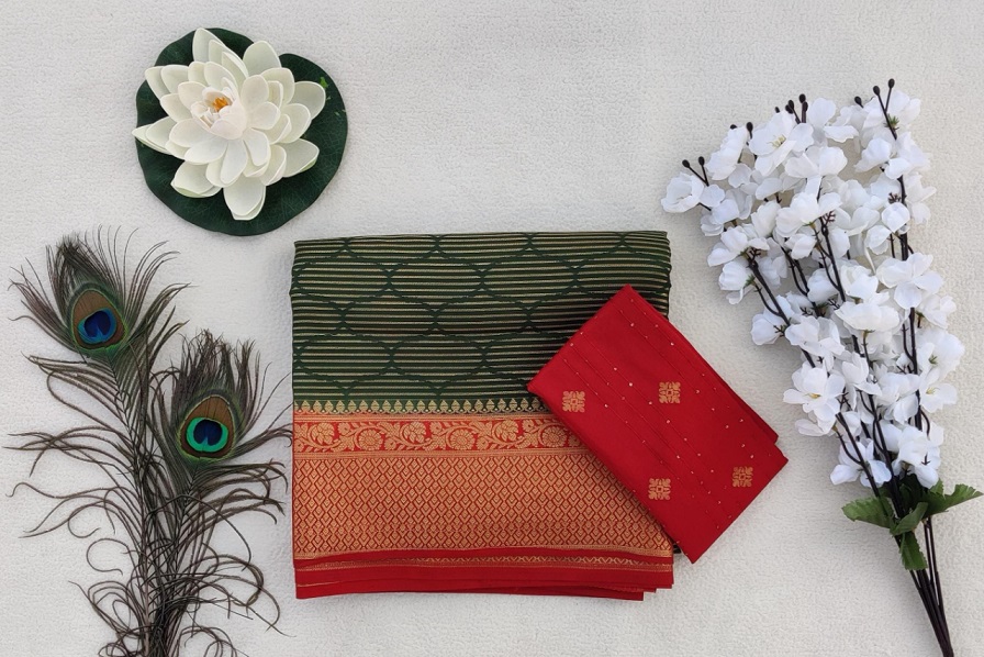 Semi Mysore Silk Saree-Green with Maroon-50%OFF