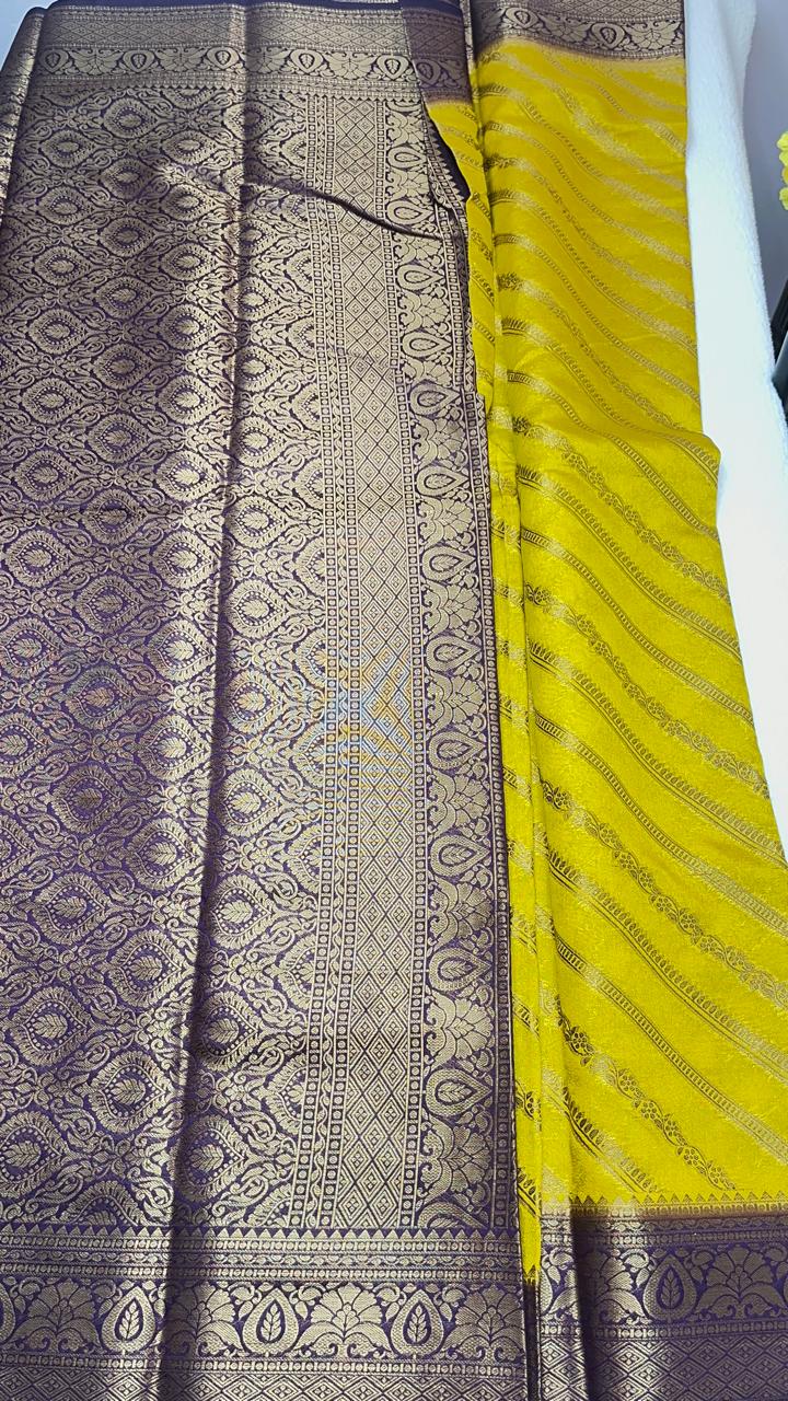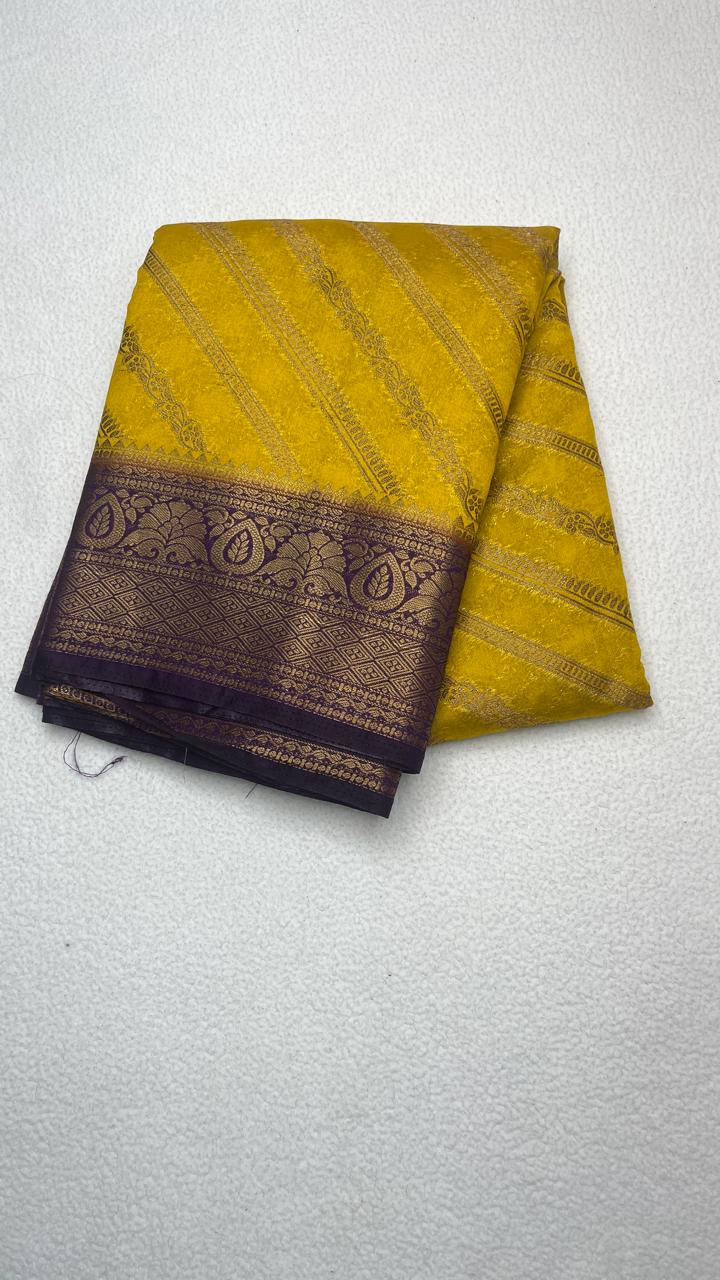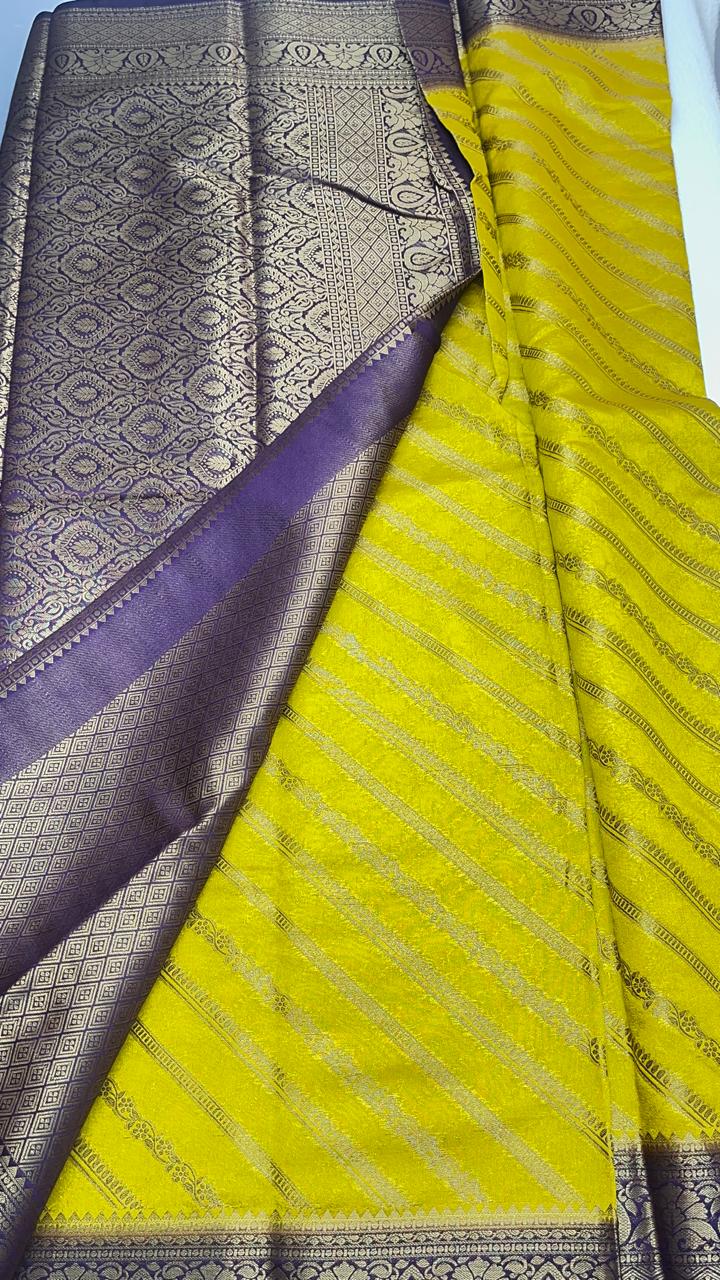 Soft Raw Sil with slanting strips all over the saree with contrast border and rich pallu and blouse